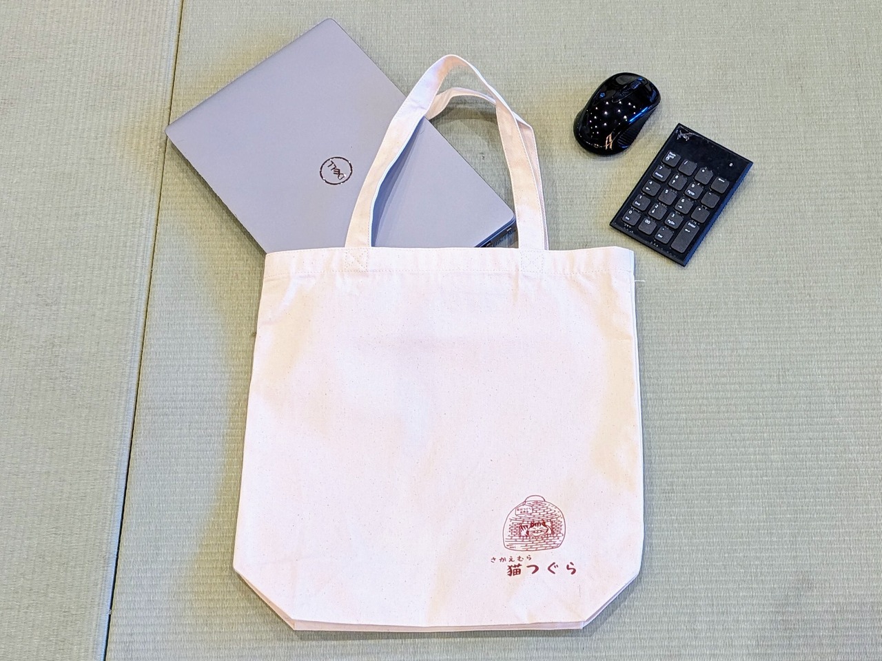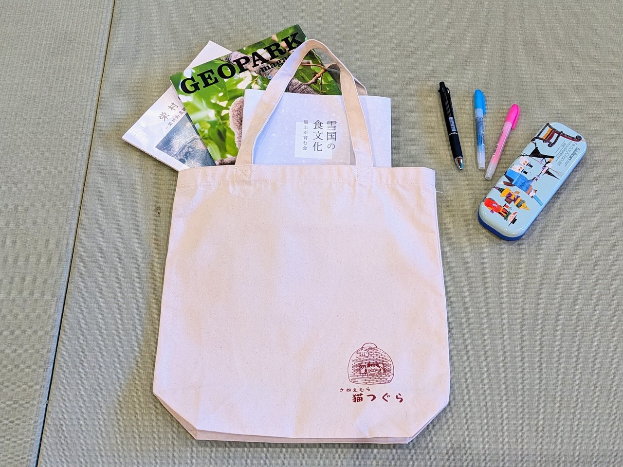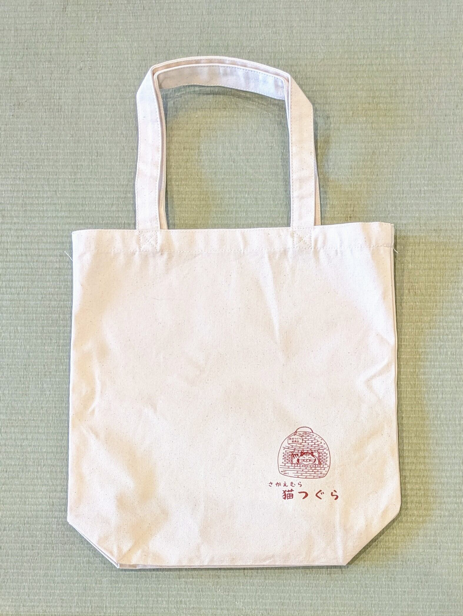 シンプルで便利な「ねこつぐらトートバッグМ」は、日常使いに最適なアイテムです。左下には愛らしいイラストと「さかえむら猫つぐら」の文字がワンポイントデザインされており、スタイリッシュでありながら、さりげなく可愛らしさを演出しています。手さげとショルダーの2WAY仕様なので、シーンに合わせた使い方が可能です。